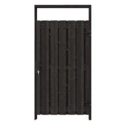 De tuindeur recht grenen geschaafd geïmpregneerd en gedompeld antraciet op zwart stalen frame is 180 cm hoog, 100 cm breed, 5,5 cm diep en heeft weinig doorkijk. De tuindeur bestaat uit 13 verticale planken die met RVS schroeven op een zwart stalen frame zijn vastgemaakt. De tuindeur is tweezijdig, kan zowel links- als rechtsdraaiend gemonteerd worden en wordt inclusief hengen geleverd.